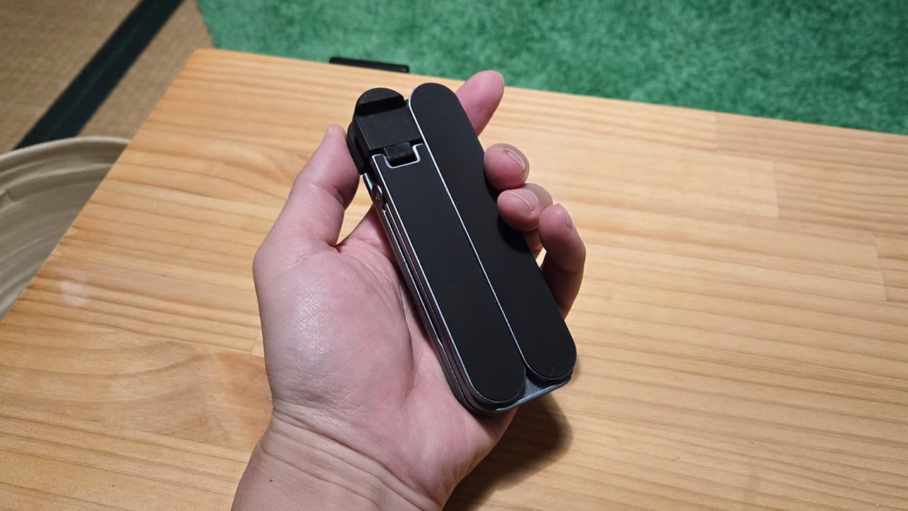 折りたたみサイズ12.7×4.4×2cmというのは、数字で見るより実物の方が驚きます。iPhone 17 Pro Max(重量231g)より軽い185gという事実が示すように、金属製スタンドとしては別次元の携帯性です。「持ち運び用スタンド」と銘打った製品でも、実際に毎日カバンに入れていると意外と存在感があるものですが、SODIはガジェットポーチの中で完全に埋もれるレベル。これが毎日の持ち運びを苦にしない最大の理由です。